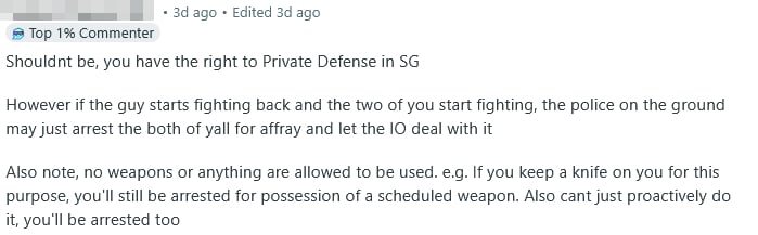 A netizen, claiming to be a foreigner, took to Reddit to ask Singaporeans about the limits of self-defence laws, with the scenario of “protecting” his girlfriend on the street.
