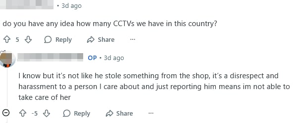 A separate netizen told the OP to call the police instead of using force. They added that Singapore’s numerous CCTVs would ensure the culprit couldn’t escape even if they walked away from the scene.