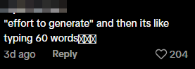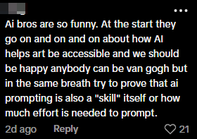 Some TikTok users criticised what they saw as contradictory attitudes among AI supporters. They also argued that generative AI requires little to no skill.