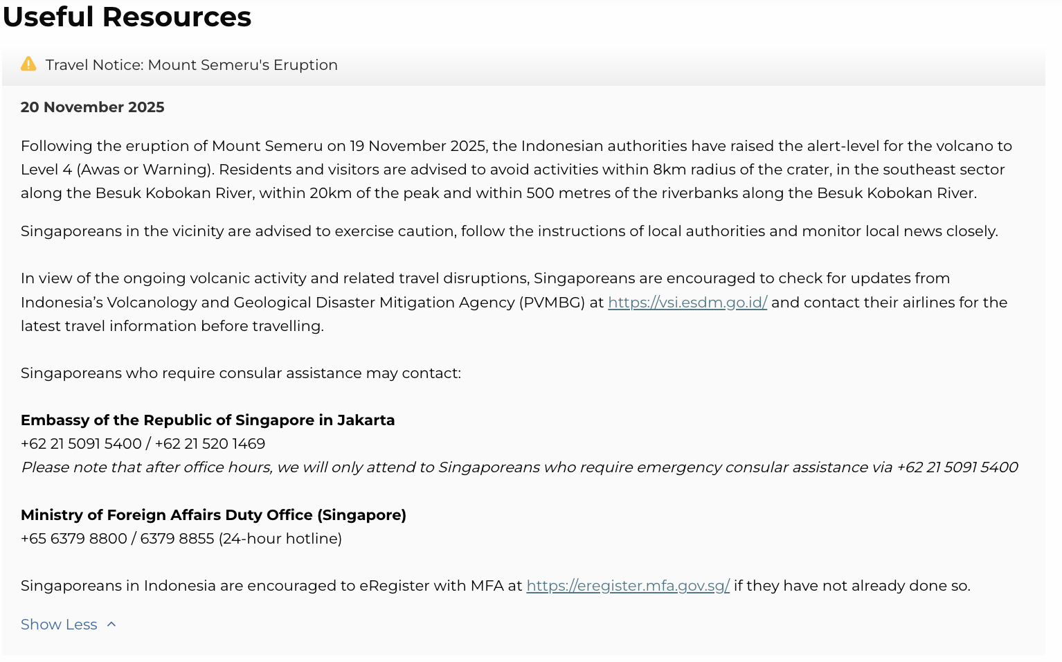 Meanwhile, Singaporeans in the area should refer to MFA’s latest travel notice on Mount Semeru, including guidance on preparing for volcanic activity and potential flight disruptions.
