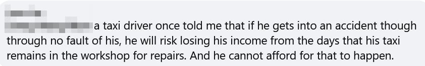 Another commenter claimed that taxi drivers lose income whenever their cars are sent in for repairs, even for accidents they were not at fault for.