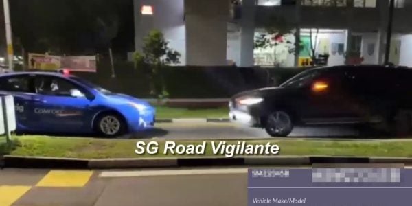 Mazda drives against traffic flow on 1-lane road in Serangoon, forces taxi to reverse & give way