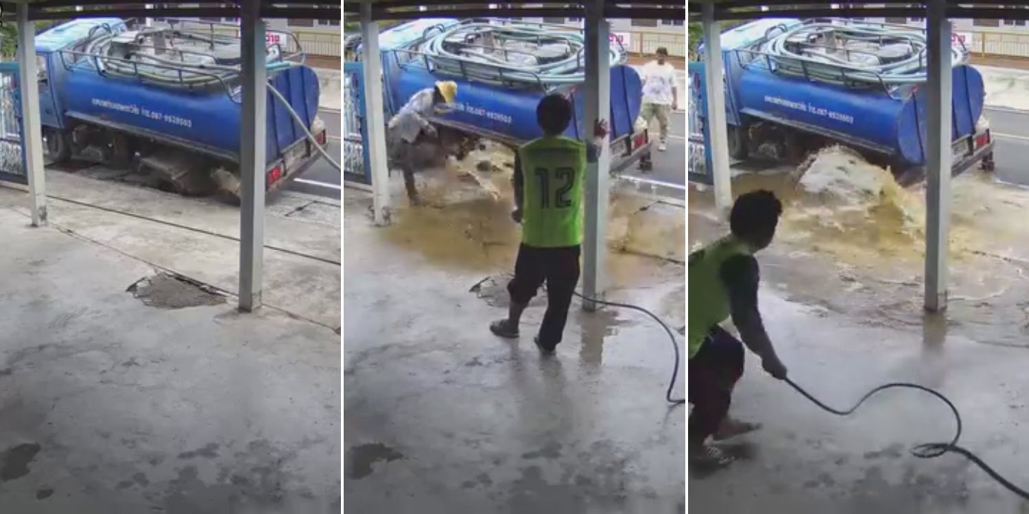 In the footage, the truck is seen parked on top of a drain cover outside a home in Roi Et province.