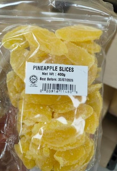 According to SFA, the product’s name is “Pineapple Slices (400g)”, with a best before date of 30 July 2026.