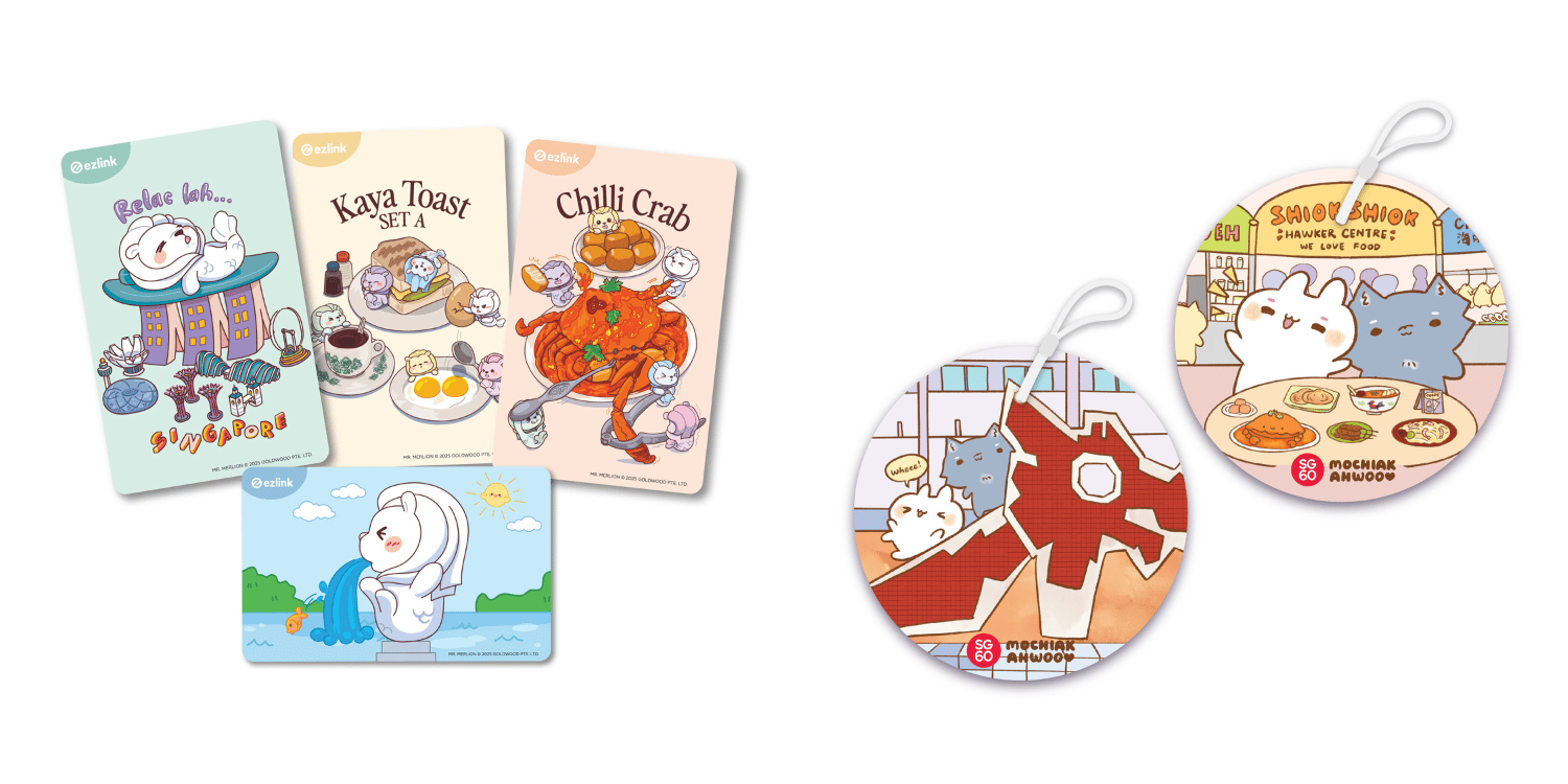 Prefer a card to a charm? The Mr Merlion EZ-Link cards come in four playful designs that spotlight Singapore’s beloved mascot in everyday local moments.