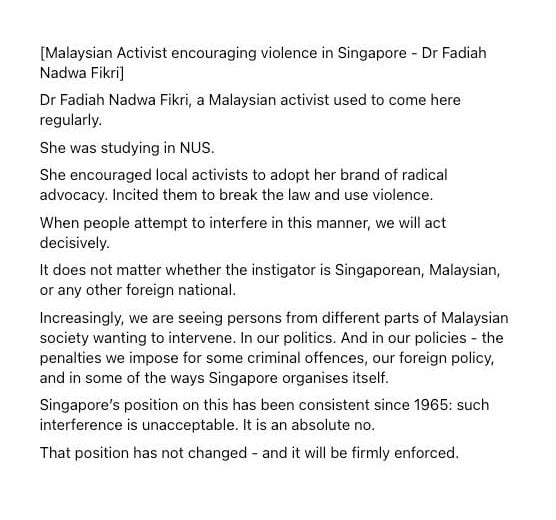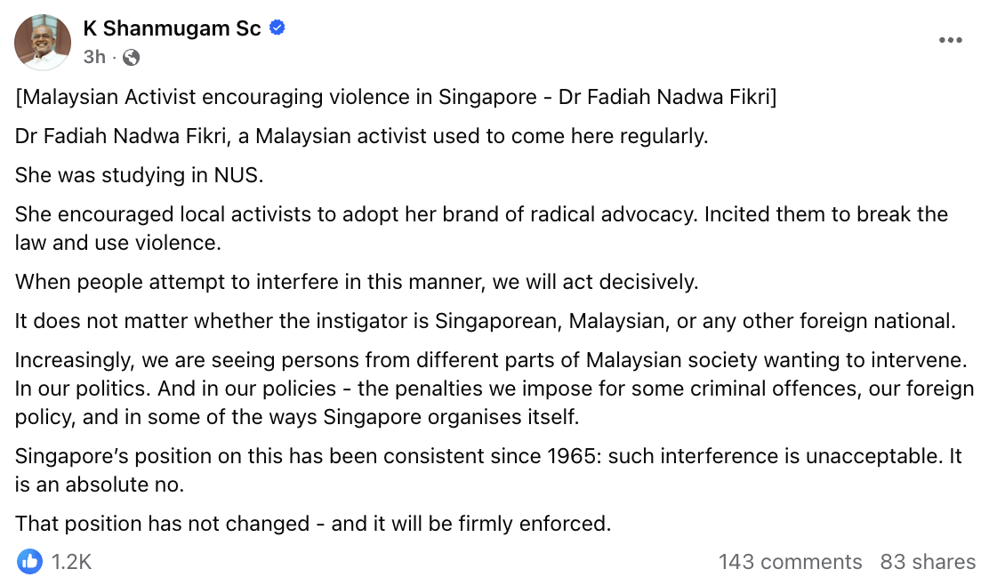 In his post, Mr Shanmugam named Dr Fadiah Nadwa Fikri, describing her as a Malaysian activist who used to regularly come to Singapore.