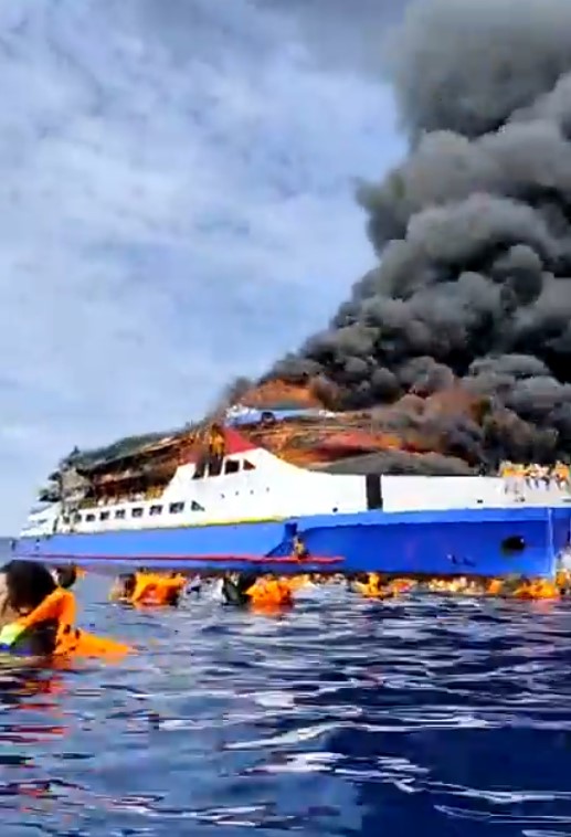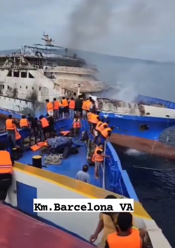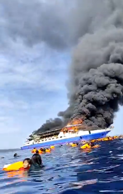 Dramatic scenes ensued after a passenger ship caught fire off the coast of Indonesia, with passengers seen jumping into the sea.
