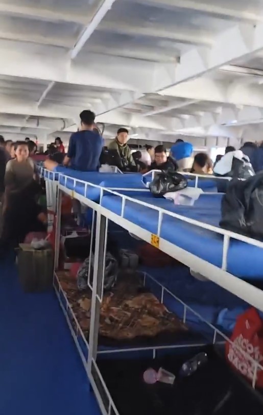 Anxious passengers are seen gathering their belongings and preparing to evacuate.