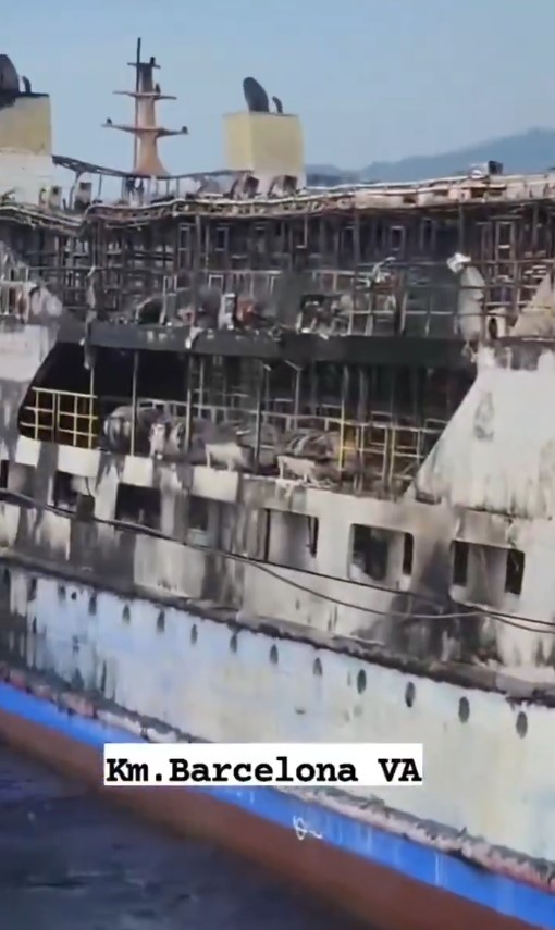 His first clip showed a fire on board a ship, which he identified as the KM III Barcelona.