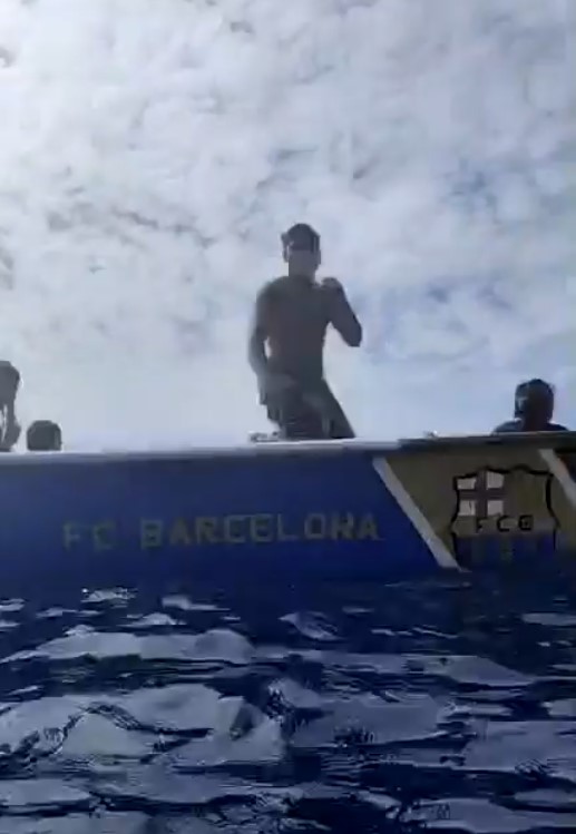 After they floated farther and farther away from the burning ship, a boat with an FC Barcelona crest passed by.
