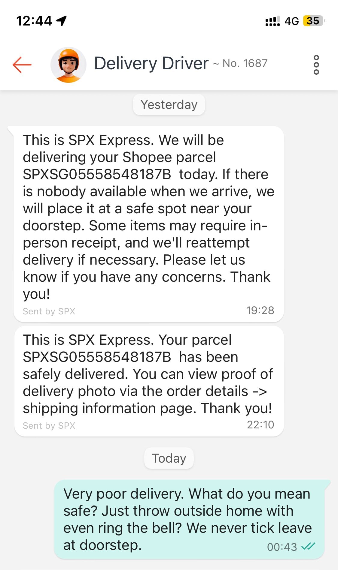 A screenshot in his post shows the delivery driver messaging him at 7.28pm to say the parcel would arrive that evening. The driver sent another message at 10.10pm, claiming he had “safely delivered” the item.