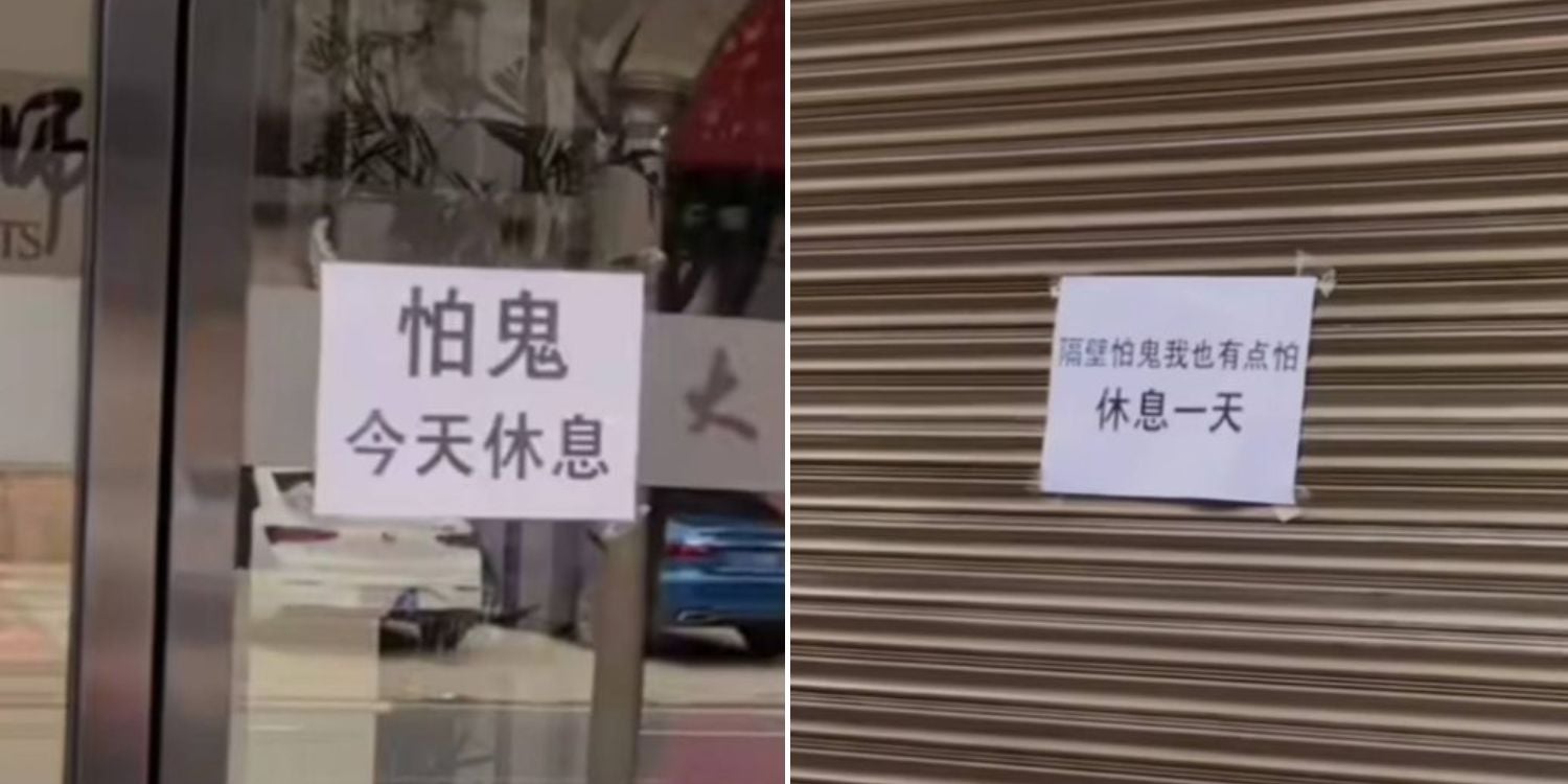 Another notice appeared at the neighbouring unit, reading: “The shop next door is afraid of ghosts. I’m also a little scared, so I’ll take the day off too.”