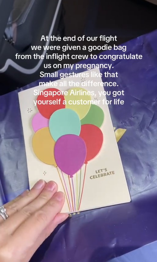 Card from Singapore Airlines crew wishes woman a smooth pregnancy
