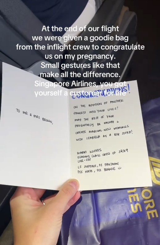 In a TikTok video, a woman said she received a handwritten card and a goodie bag from the crew, who congratulated her on her pregnancy.