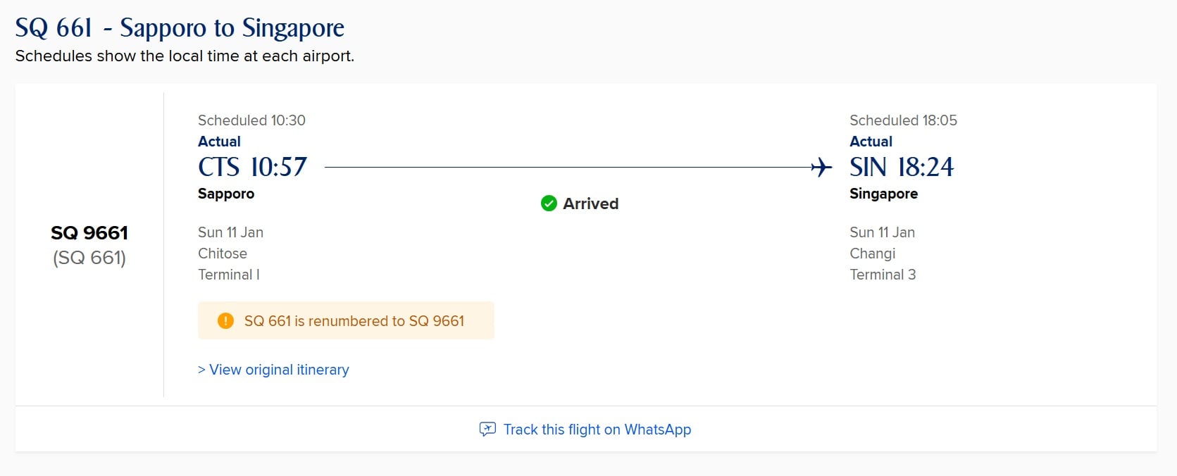SIA flew the affected passengers back to Singapore on a ferry flight that departed Sapporo at 10.57am on 11 Jan and arrived at 6.24pm the same day.