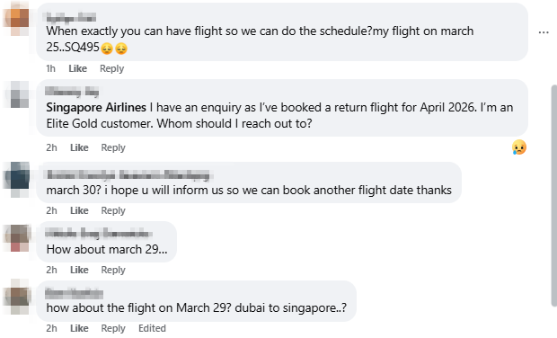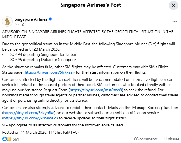 In an update posted to Facebook on Wednesday (11 March), SIA said flights SQ494 (Singapore-Dubai) and SQ495 (Dubai–Singapore) will be cancelled until 28 March due to the “geopolitical situation in the Middle East”.