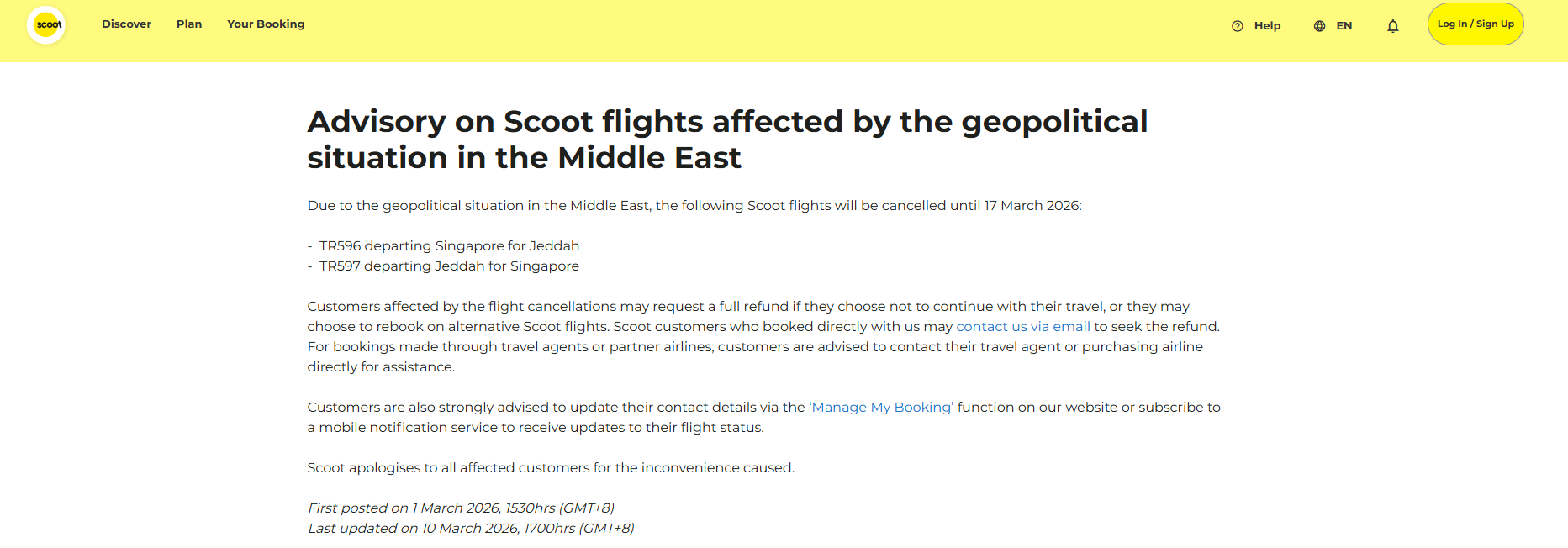 Low-cost carrier Scoot also announced that flights TR596 (Singapore-Jeddah) and TR597 (Jeddah-Singapore) will remain cancelled until 17 March.