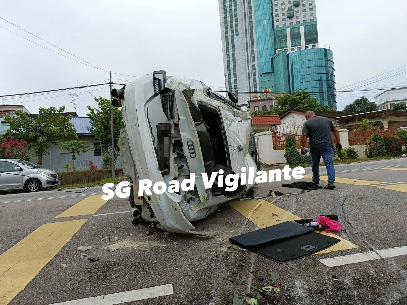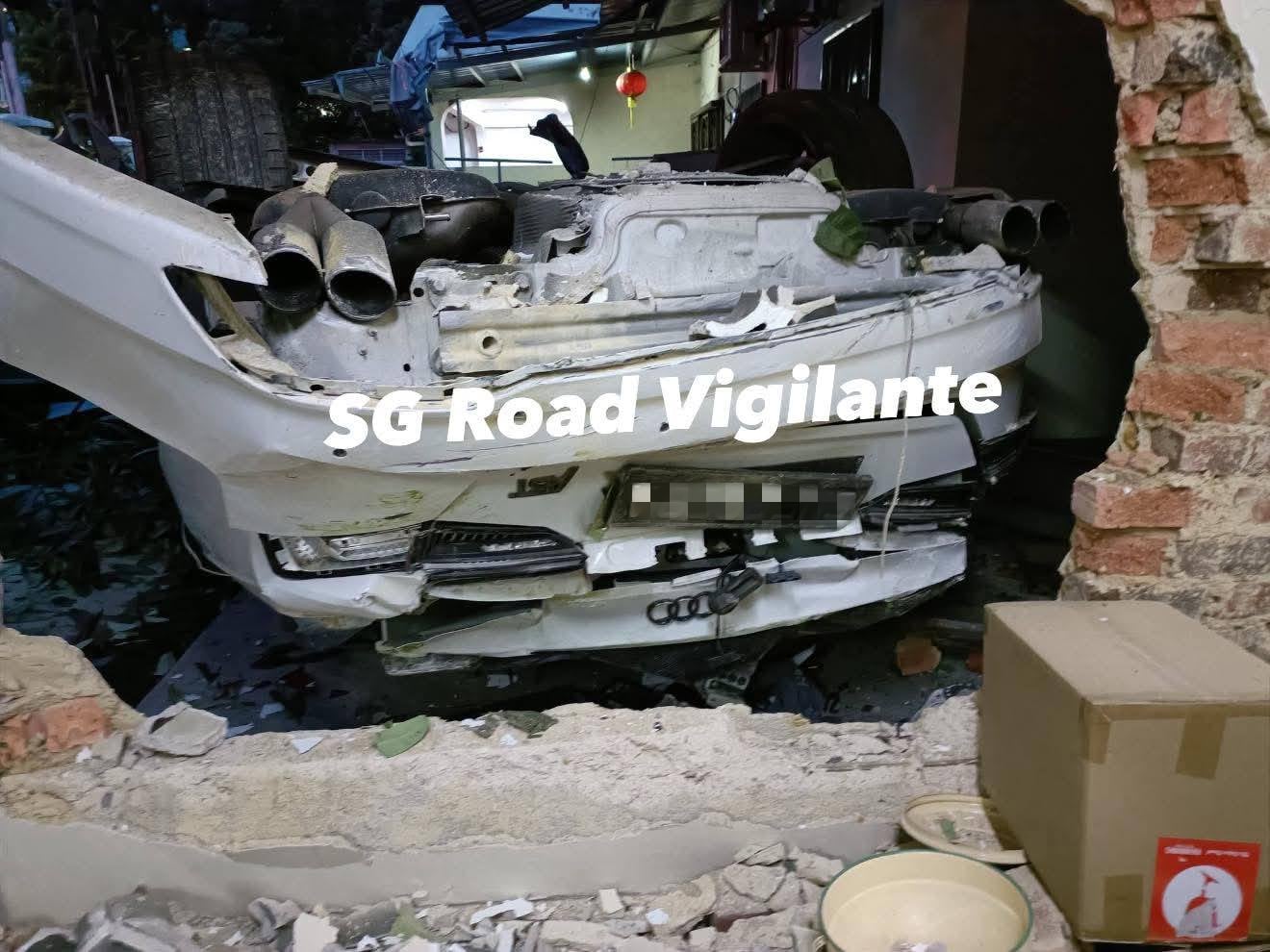 Photos of the accident, posted by SG Road Vigilante on Facebook, showed the white Audi lying upside down inside one of the houses.