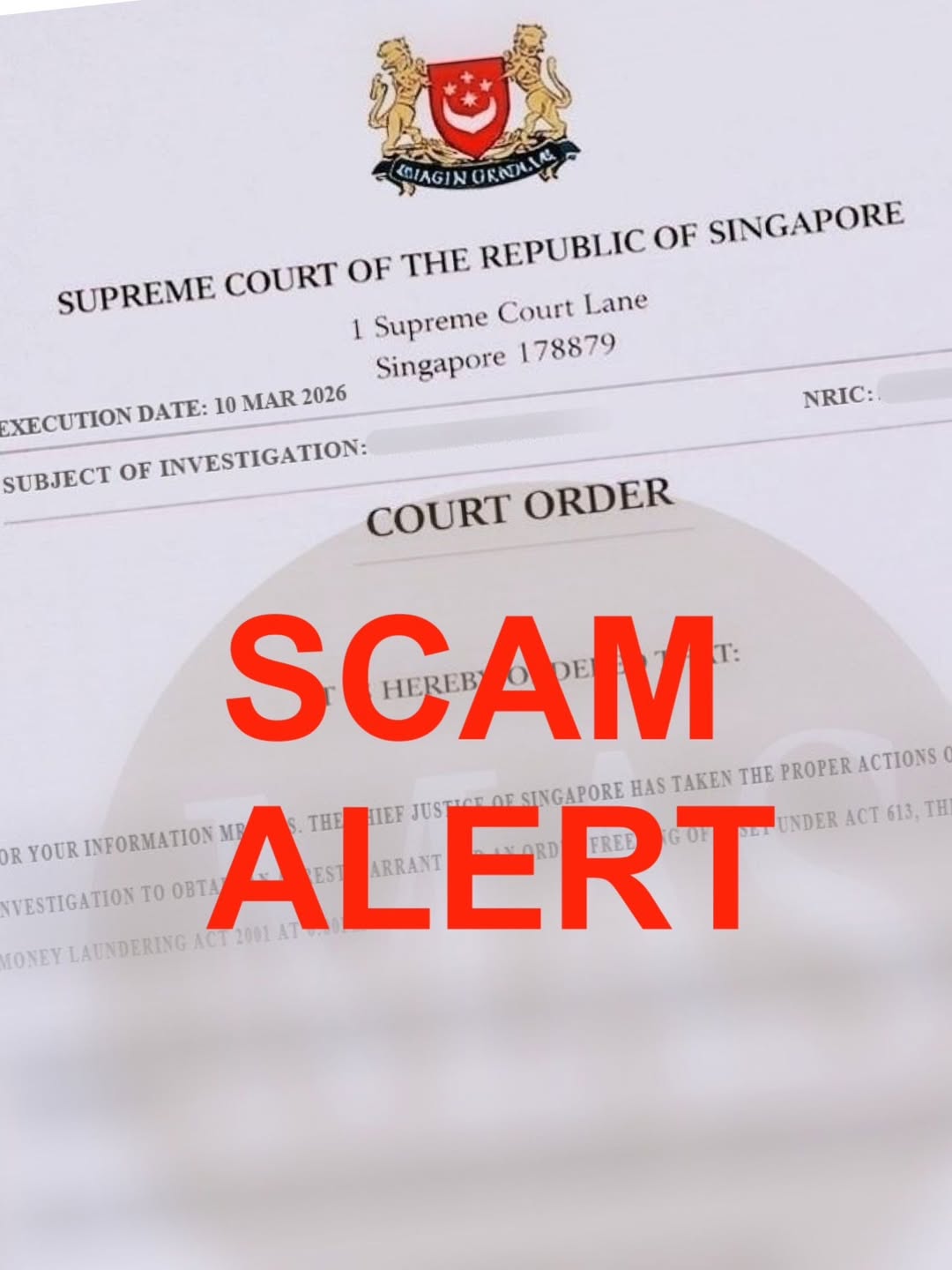 The Singapore Courts have issued a warning about a scam involving fraudulent “court orders” that pressure victims into transferring money.