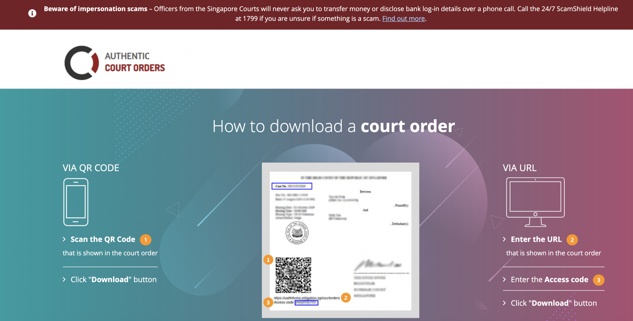This can be done via www.courtorders.gov.sg, which allows users to check if an order is legitimate.