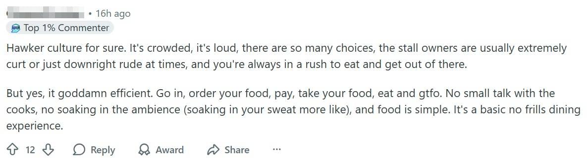 One netizen agreed that Singapore’s hawker culture is extremely “efficient” and a “basic no frills dining experience”.