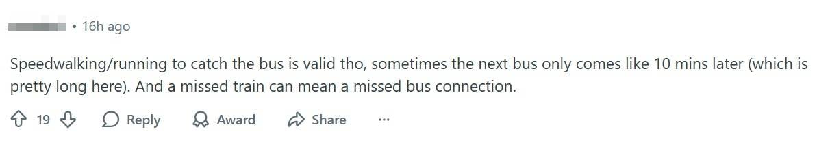 Another pointed out that rushing for a bus can make sense, as the next one may not arrive as quickly as the MRT, especially if a transfer is involved.
