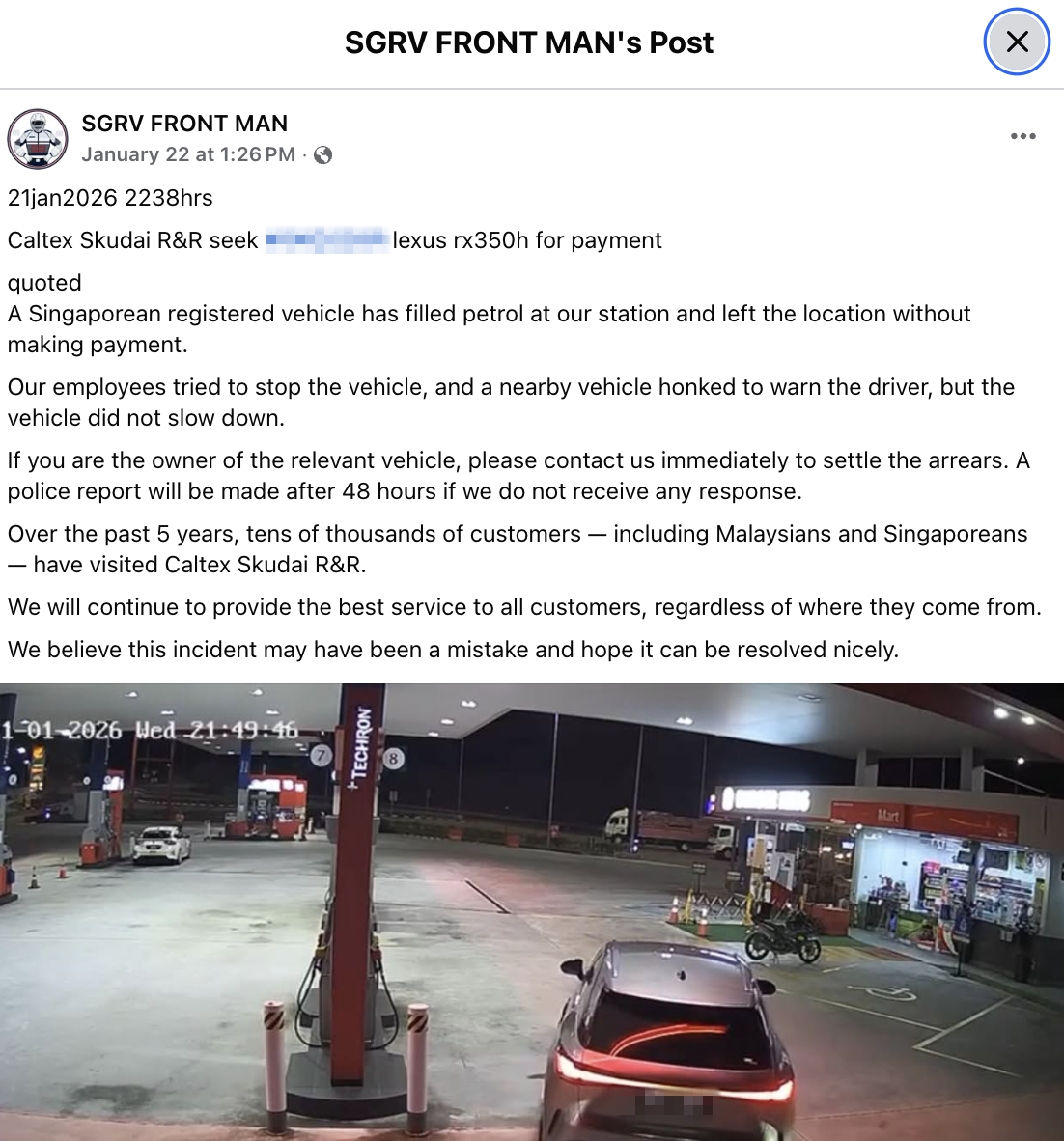 The post stated that “a Singapore-registered vehicle filled petrol at our station and left without making payment”.