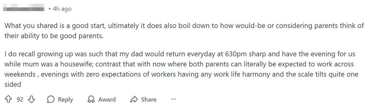 “My take [is that] the biggest barrier to having kids in Singapore isn’t money,” the OP wrote. “It’s the belief that you need to give them a perfect life.”