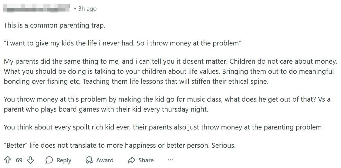 Another commenter said that relying heavily on money to raise a child can become a “common parenting trap”.