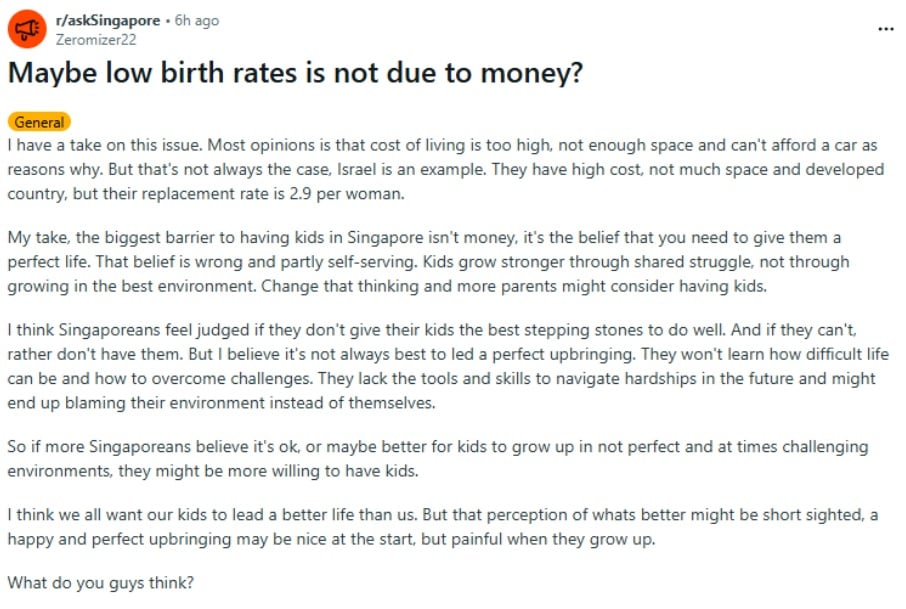 A Singaporean Redditor has sparked discussion online after suggesting that the country’s low birth rates may not be mainly due to financial pressures.
