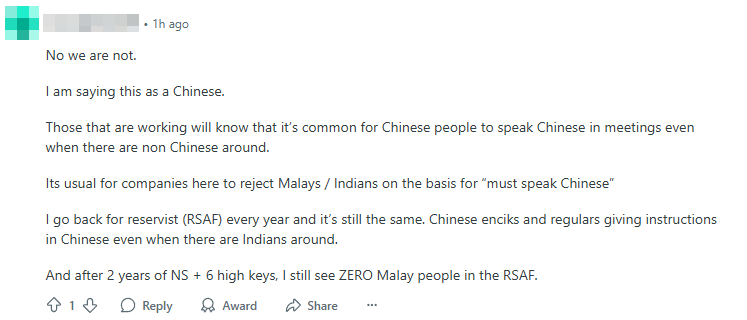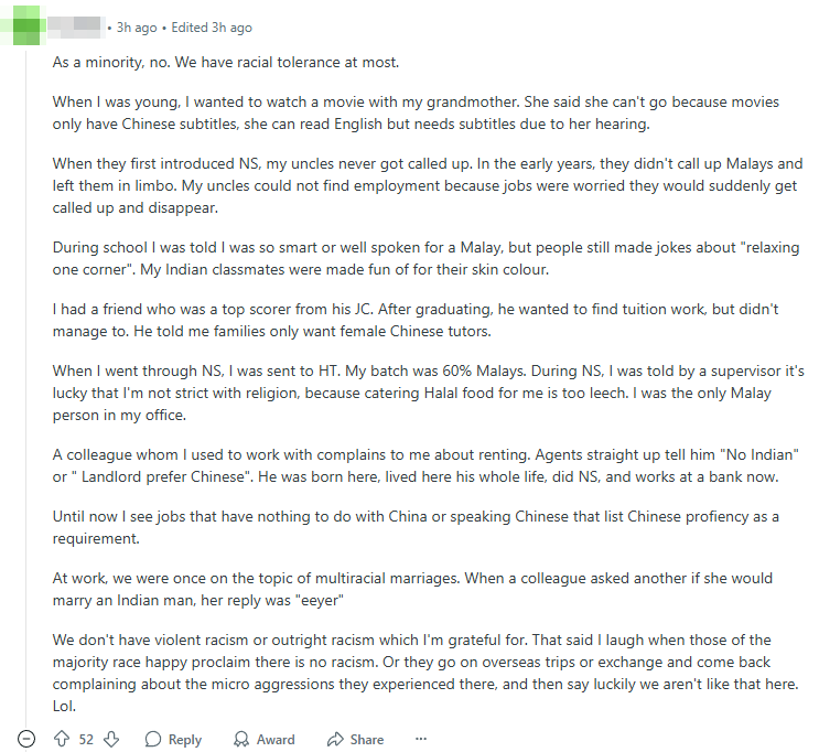 One commenter, who identified as a minority, claims Singapore practices “racial tolerance at most”.