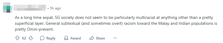 An expatriate described Singapore’s multiracialism as being on a “pretty superficial layer”. “General subtextual (and sometimes overt) racism towards the Malay and Indian populations is pretty omnipresent,” they claimed.