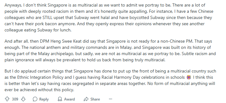 Yet interestingly, a netizen’s Reddit thread titled “Are we really as multiracial as we think?” has led to Singaporeans sharing diverse views on the matter.