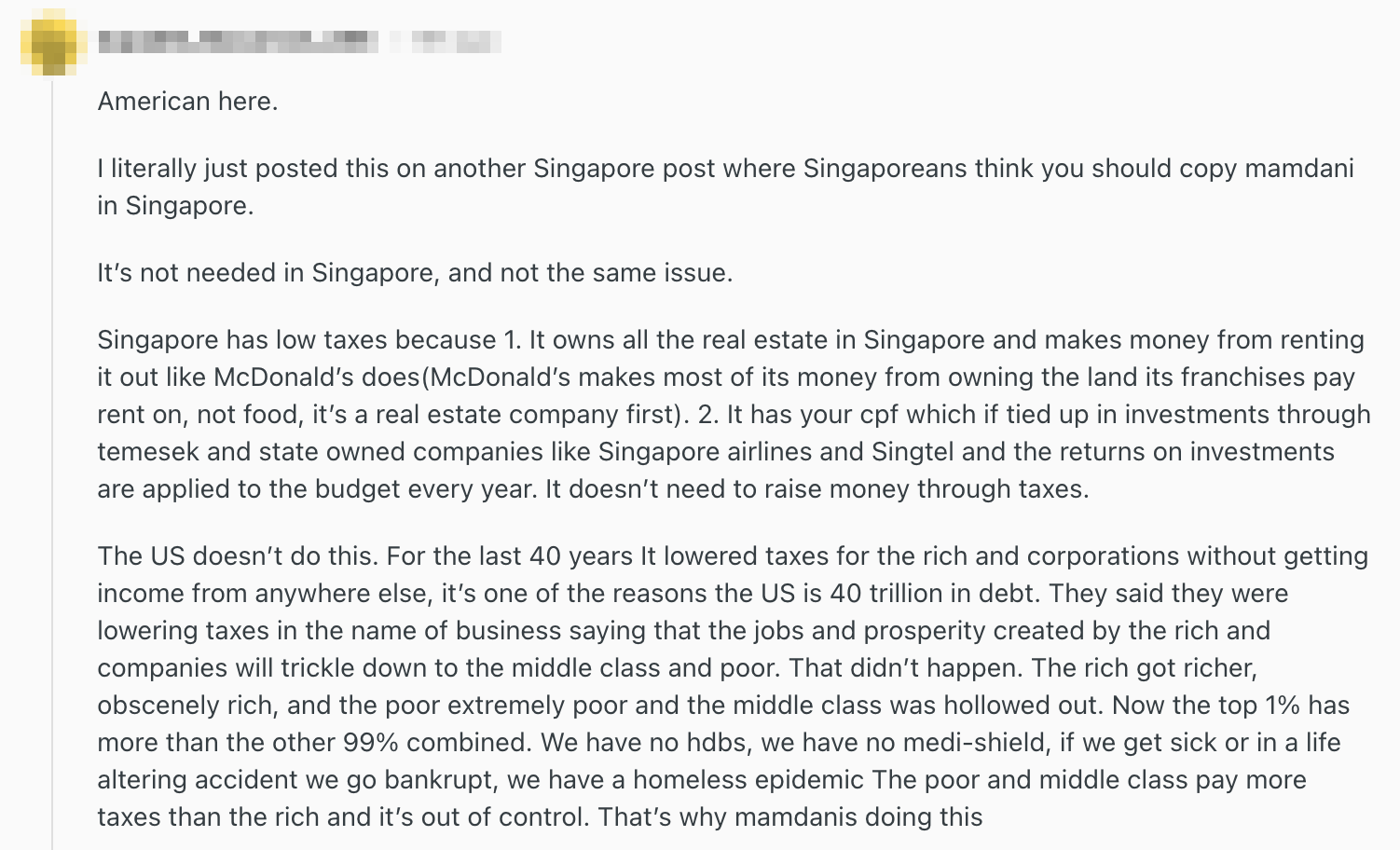 They pointed out that Singapore relies heavily on state-linked revenue sources, such as government-owned real estate and investment returns from entities like Temasek, rather than high taxes.
