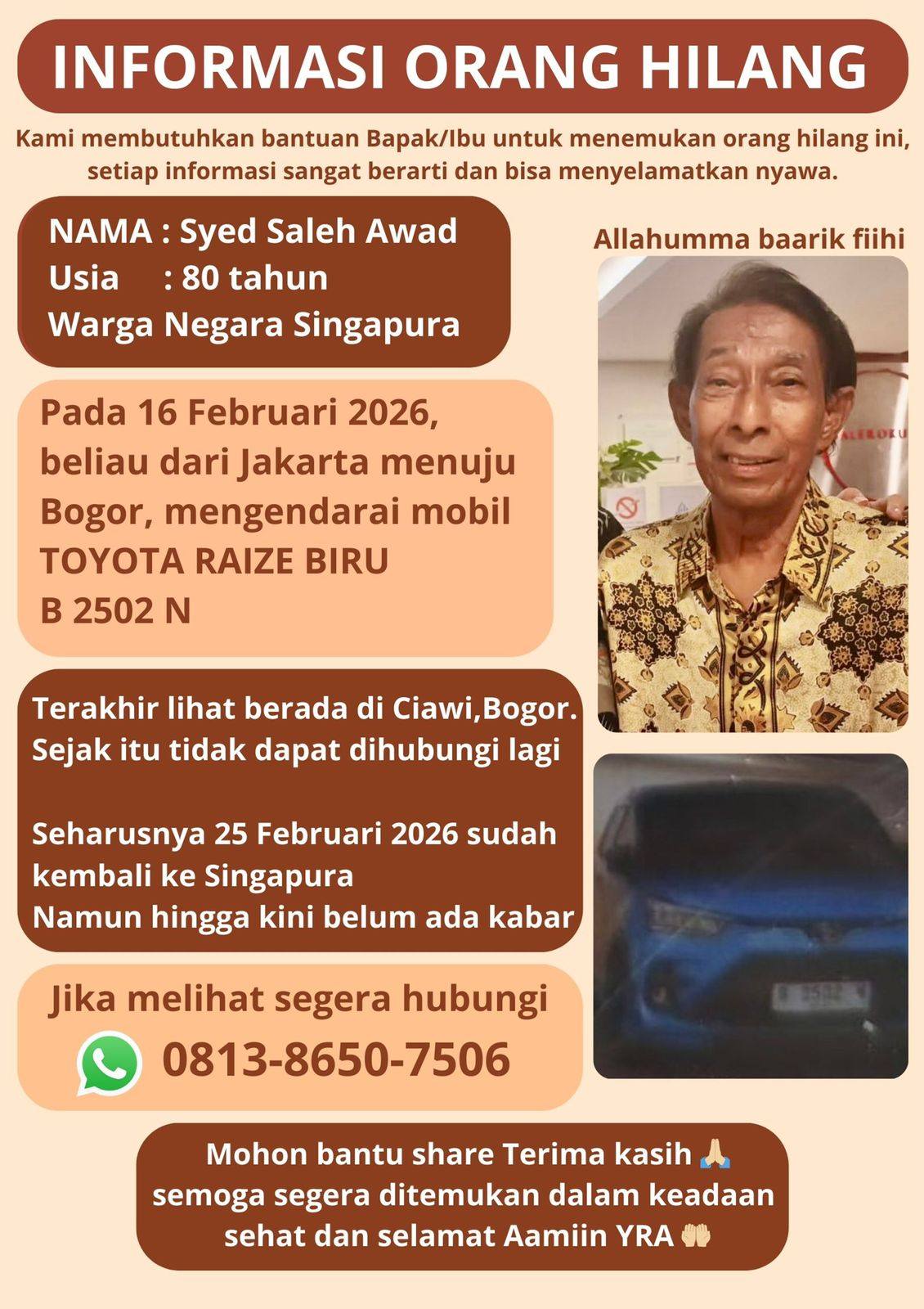 He was last seen in Ciawi, Bogor and was supposed to return to Singapore on 25 Feb.