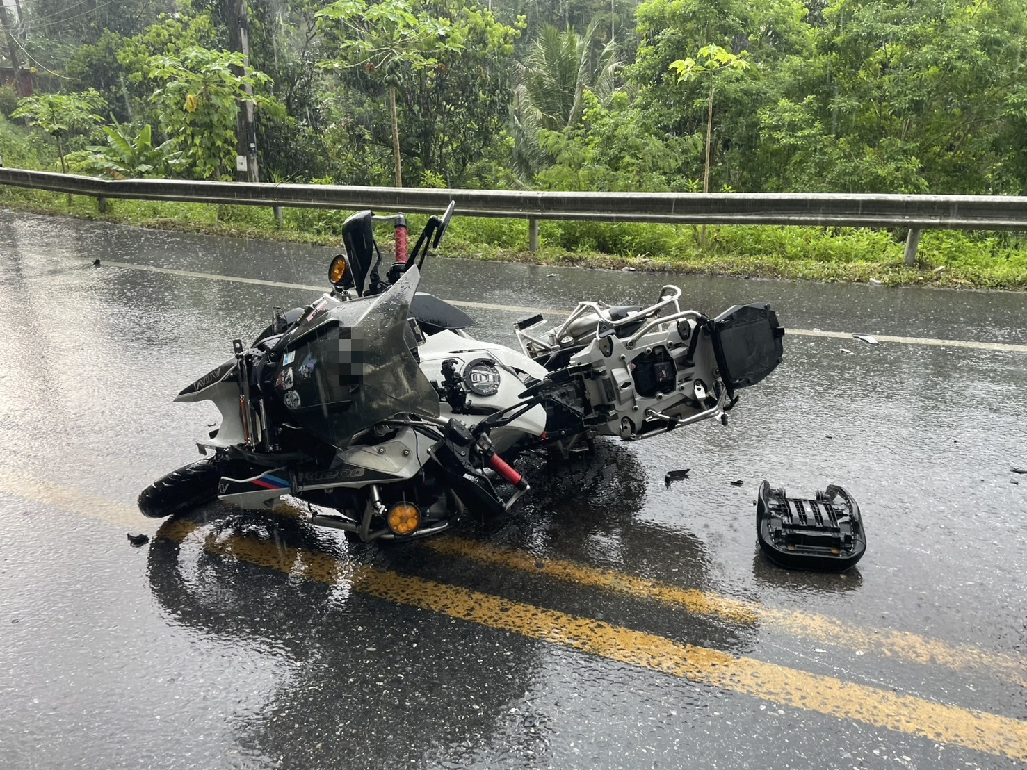 The police shared photos showing the damaged, Singapore-registered motorcycle lying on the wet road with debris around it.
