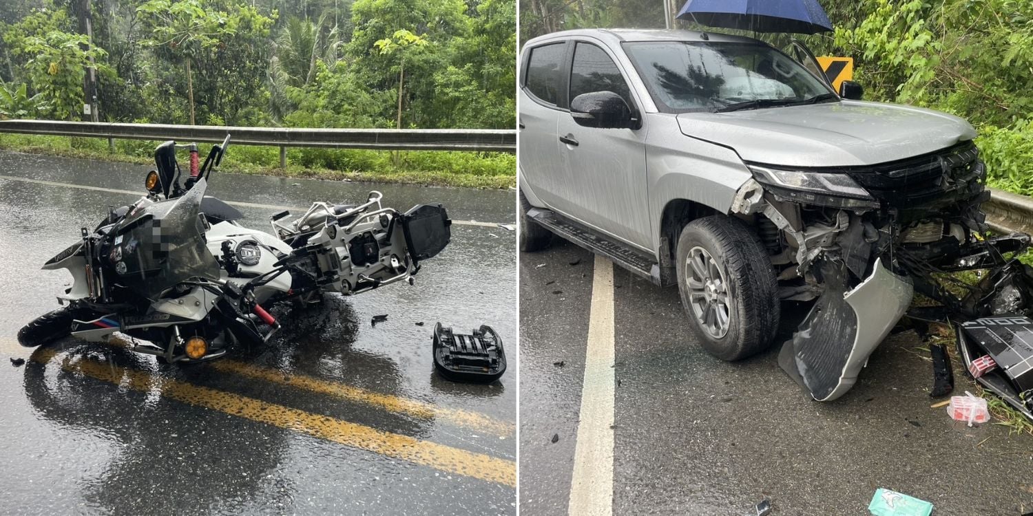 The police shared photos showing the damaged, Singapore-registered motorcycle lying on the wet road with debris around it.