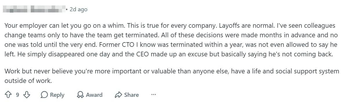 The abrupt nature of such exits, the OP said, has made it difficult to believe in long-term job stability or employer loyalty.