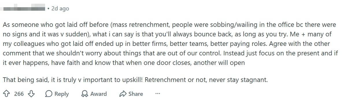 Others shared personal experiences of being retrenched, with one Redditor noting that they eventually moved on to a “better firm, better team, and better pay”.