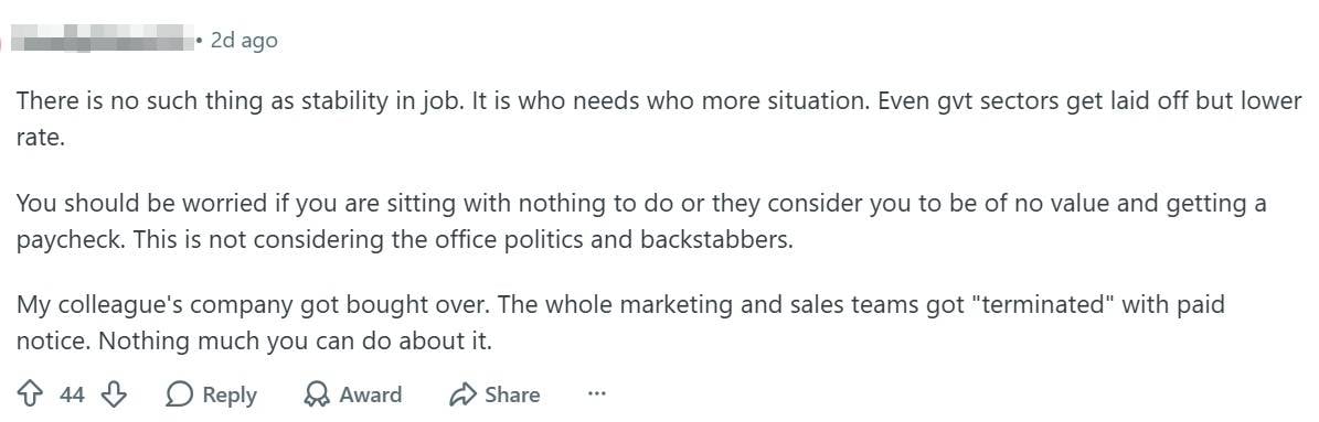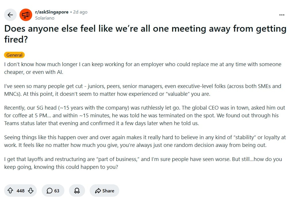 A candid Reddit post has struck a nerve among Singapore employees, with many saying that layoffs and workplace uncertainty are becoming increasingly common.
