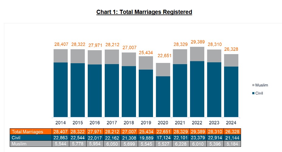 On 7 July, MSF released its Family Trends Report, which stated that there were 26,328 marriages registered in Singapore last year — a 7% drop from the 28,310 in 2023.