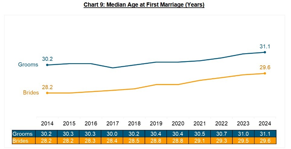 The median age for brides has been rising ever since 2014, from 28.2 to a record high of 29.6 in 2024.