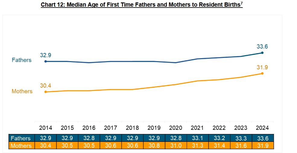 In a similar vein, the median age of first-time fathers and mothers trended upwards as well to 33.6 and 31.9 years old, respectively.