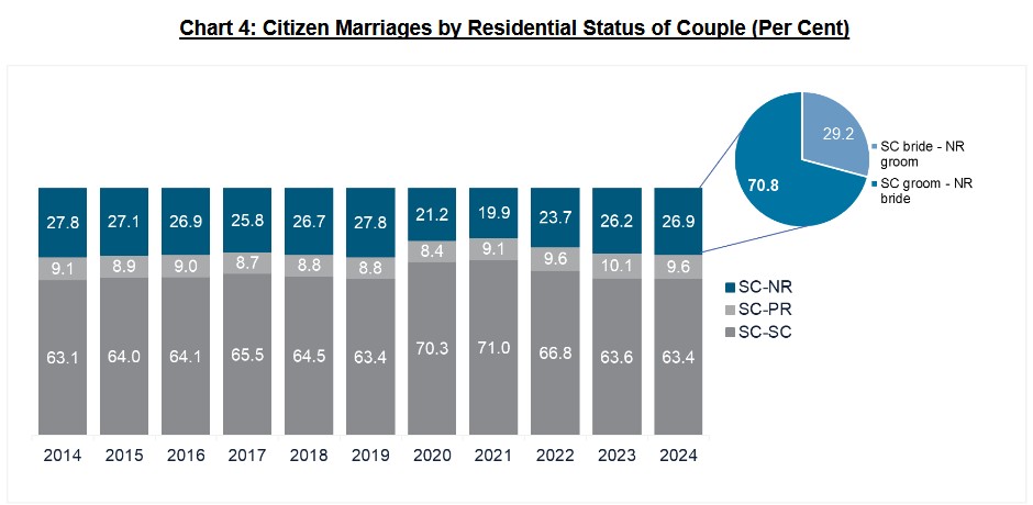 Marriages between Singapore citizens made up the majority in 2024, at 63.4%.