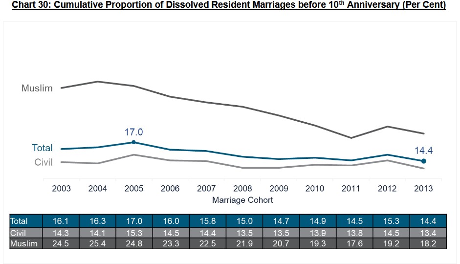 Muslim marriage dissolutions in particular showed a significant drop from 25.4% in 2004 to 18.2% in 2013.