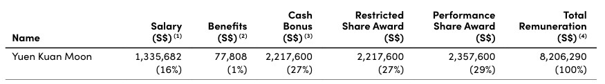 The rest comprised a cash bonus of S$2,217,600 (27%) and the same amount in a restricted share award.