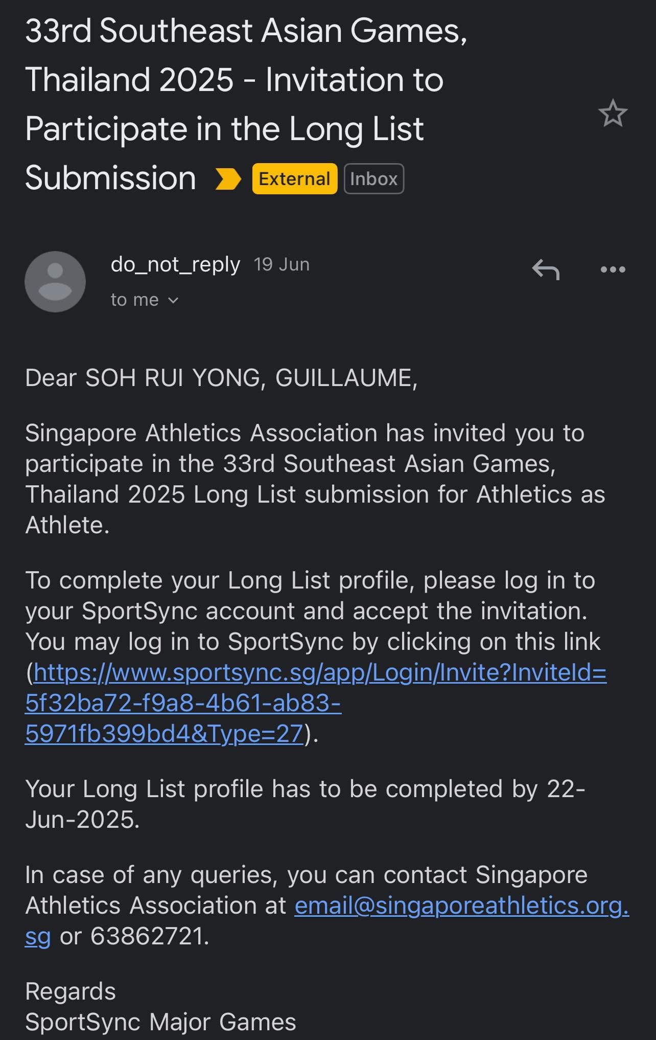 On 24 June, Soh shared on Facebook that Singapore Athletics (SA) had nominated him for two events, with the final decision lying with SNOC.