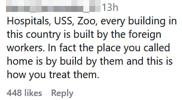 “Every building in this country is built by the foreign workers,” one netizen wrote. “In fact, the place you call home is built by them, and this is how you treat them.”