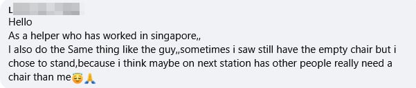 One commenter, who claimed to have been a helper working in Singapore, said she chooses to stand despite empty seats in case someone who needed it more boarded at the next station.