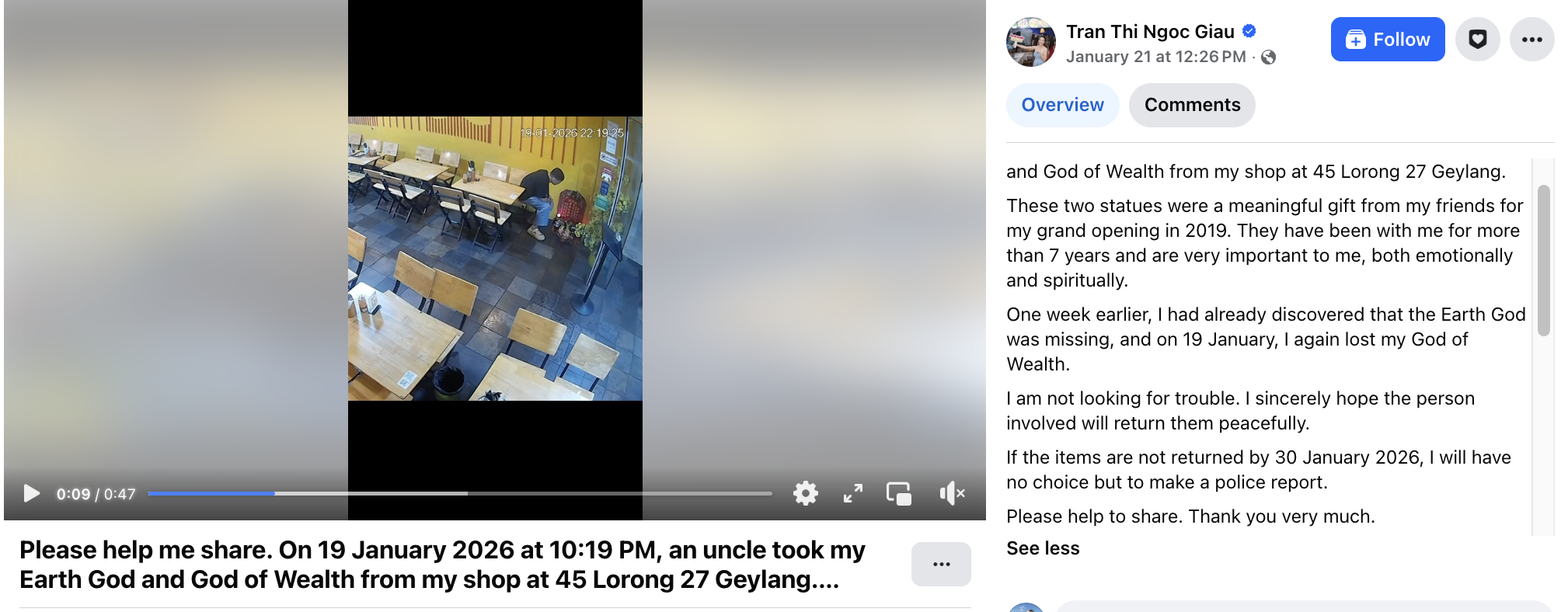 The appeal was posted on Wednesday (21 Jan) on Facebook by Ms Trần Thị Ngọc Giàu, after she discovered that both her Earth God and God of Wealth statues were missing from her premises at 45 Lorong 27 Geylang.